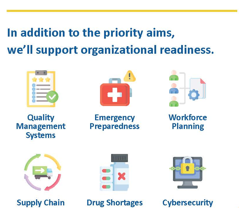 - Tailored Assistance: Receive individual or group support from experienced quality improvement advisors and subject matter experts who will work directly with your team to address your specific challenges.
